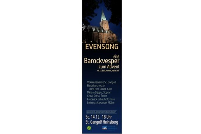 In der Propsteikirche St. Gangolf in Heinsberg wird der Evensong im Advent in diesem Jahr als feierliche barocke Vesper gestaltet. Das Vokalensemble St. Gangolf lädt dazu ein, in der besonderen Atmosphäre der mit Kerzenlicht stimmungsvoll dekorierten Kirche zur Ruhe zu kommen und barocke Festmusik zu erleben.