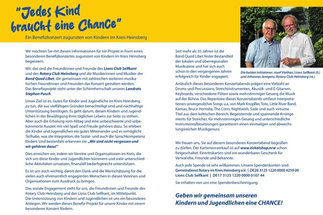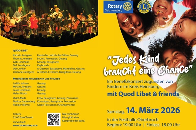 Unter dem Motto „Jedes Kind braucht eine Chance“ laden der Rotary Club Heinsberg und der Lions Club Selfkant zu einem besonderen Benefizkonzert zugunsten von Kindern und Jugendlichen im Kreis Heinsberg ein. Gemeinsam mit der Band Quod Libet & friends erwartet Sie ein musikalisch vielfältiger Abend – verbunden mit einem klaren Ziel: Hilfe dort zu ermöglichen, wo junge Menschen Unterstützung, Teilhabe und neue Perspektiven brauchen.